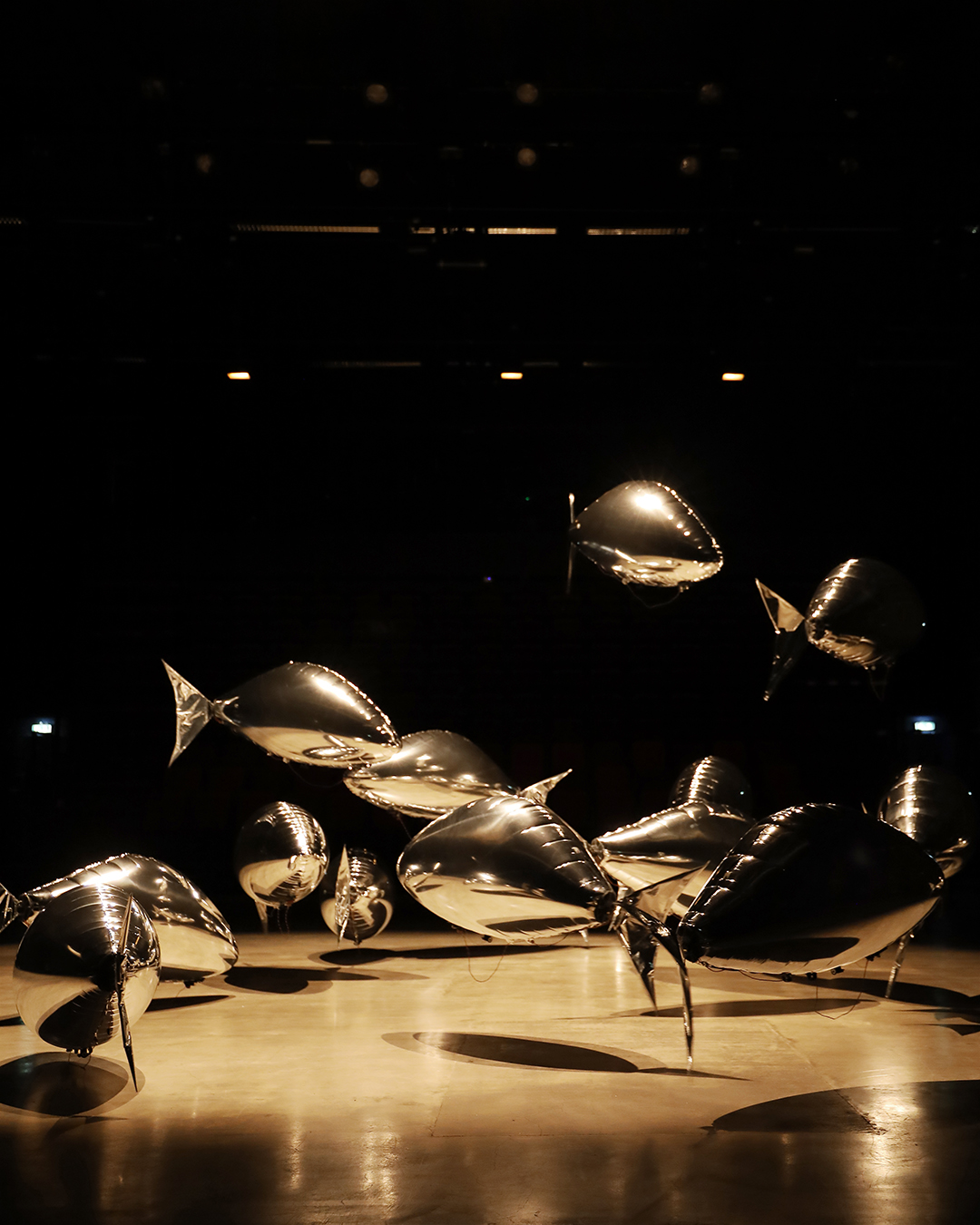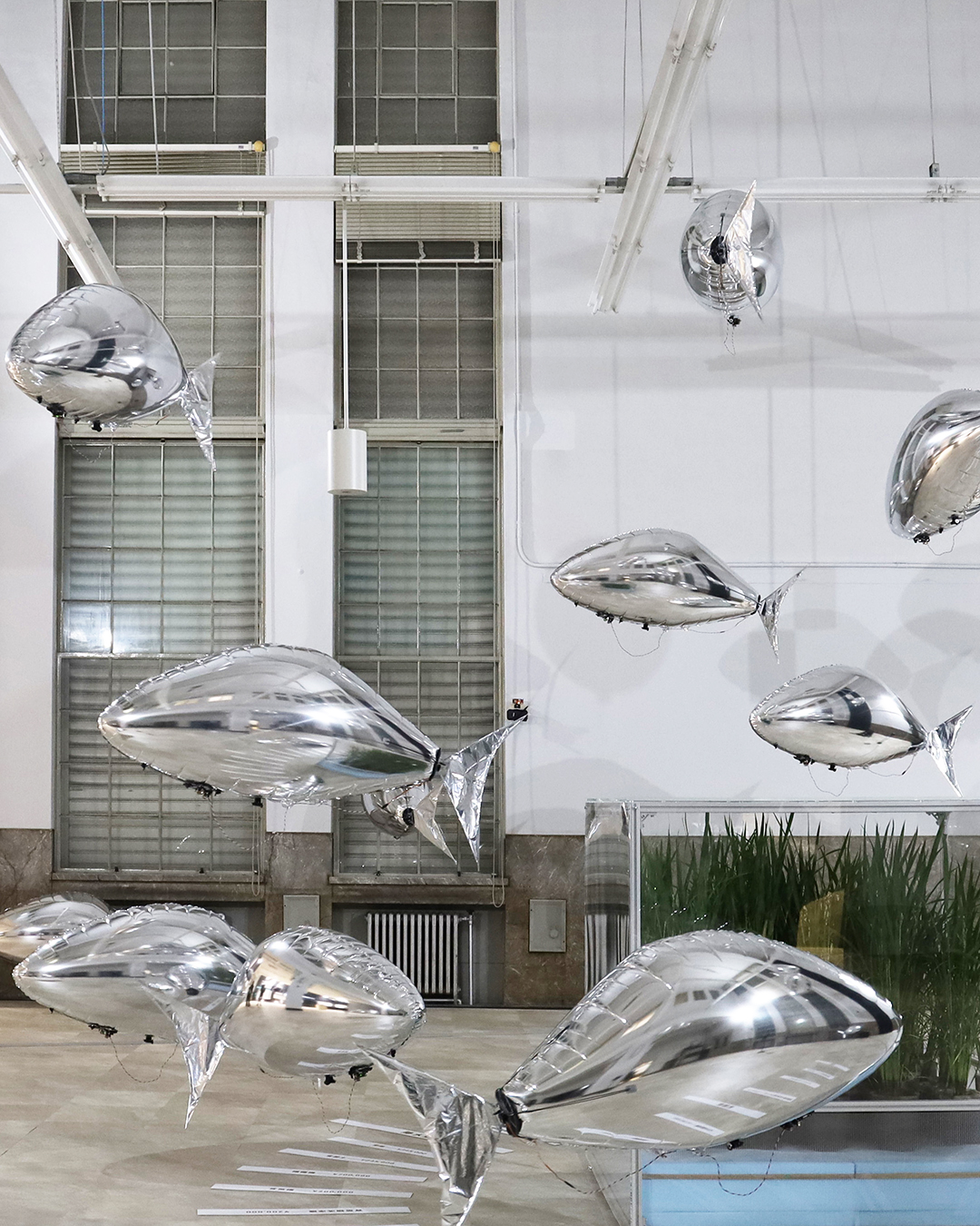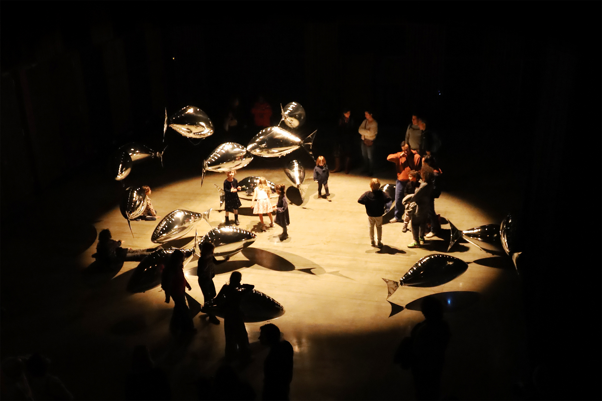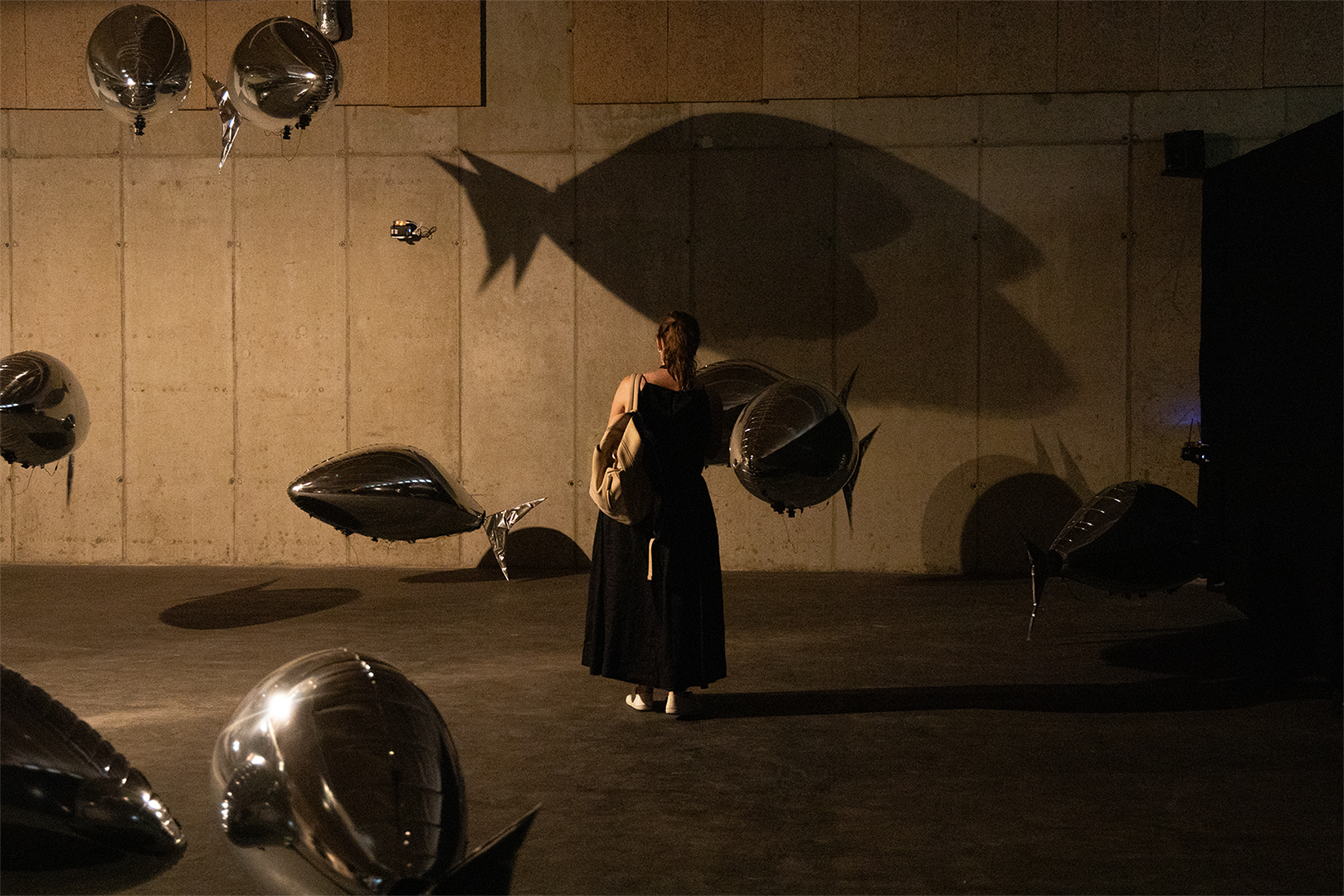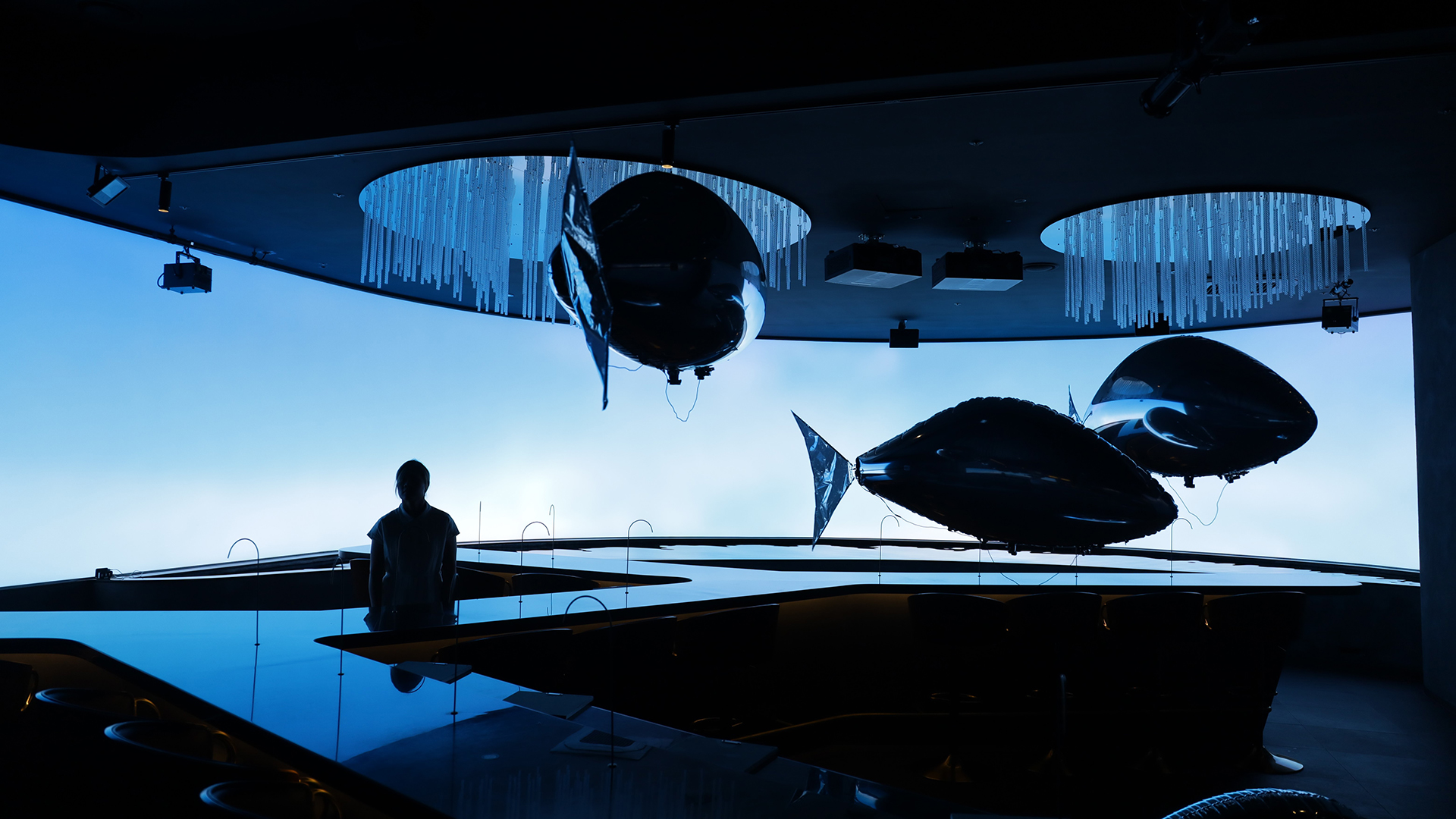 FLOCK OF by bit.studio - Discover the supernatural nature of floating fish. An immersive installation art that presents a spectacle of a school of fish soaring through the air, transformation into a flock of fish. Traverse the borderlands of art and technology.